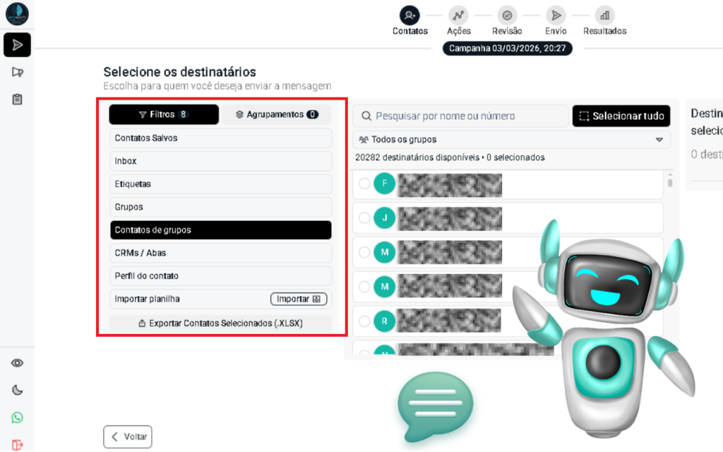 Selecione os contatos de uma aba que criou e envie mensagens em massa como uma oferta, um lembrete, um retorno de contato, o que você quiser enviar para várias pessoas de uma só vez.