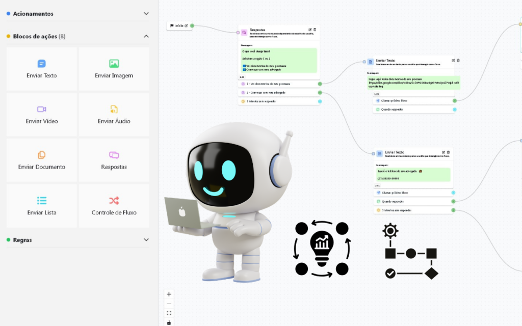Ao receber um contato, você pode montar um fluxo de mensagens. Assim você otimiza seu tempo com envios já programados de acordo com cada fluxo de atendimento